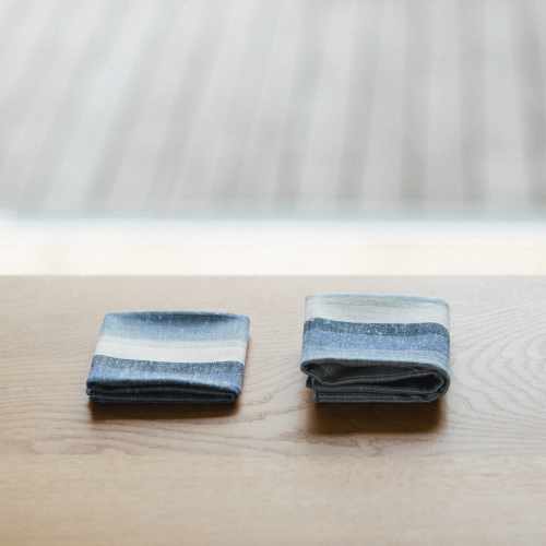 使うほど柔らかく 写真左は10回以上洗濯して使い続けたもの、写真右は新品のはんかち。このように遠州綿紬は、使い込むほどほっくりと厚みが増します。使い込まれたデニムのように、あなただけの表情に育っていくのです。
